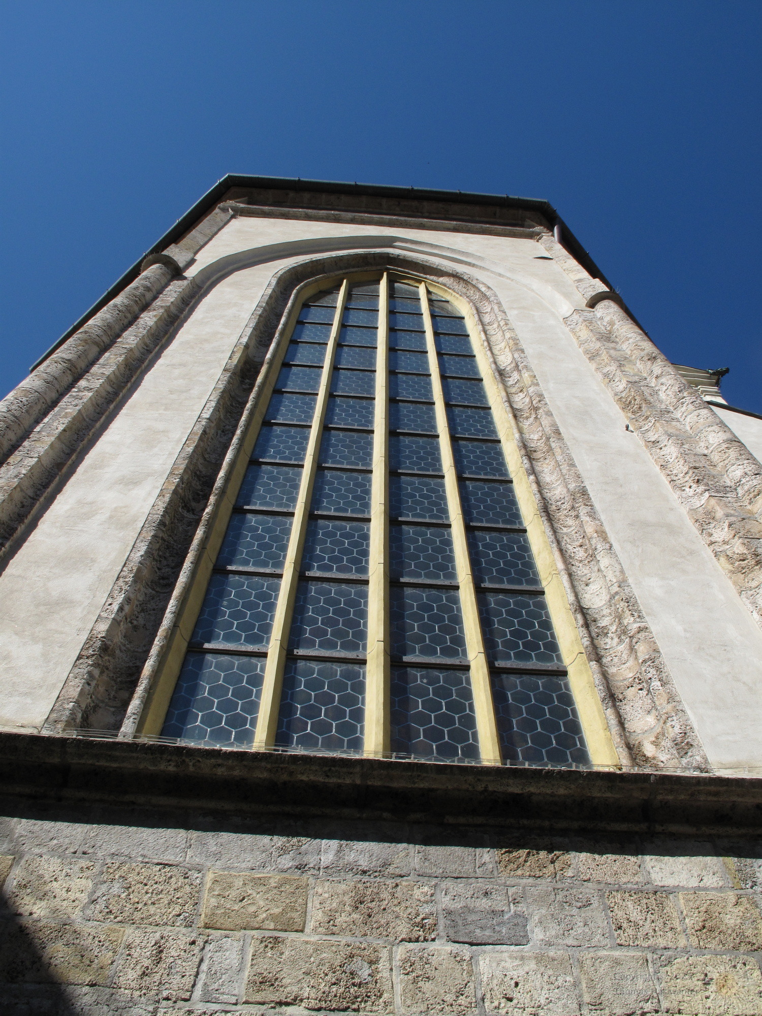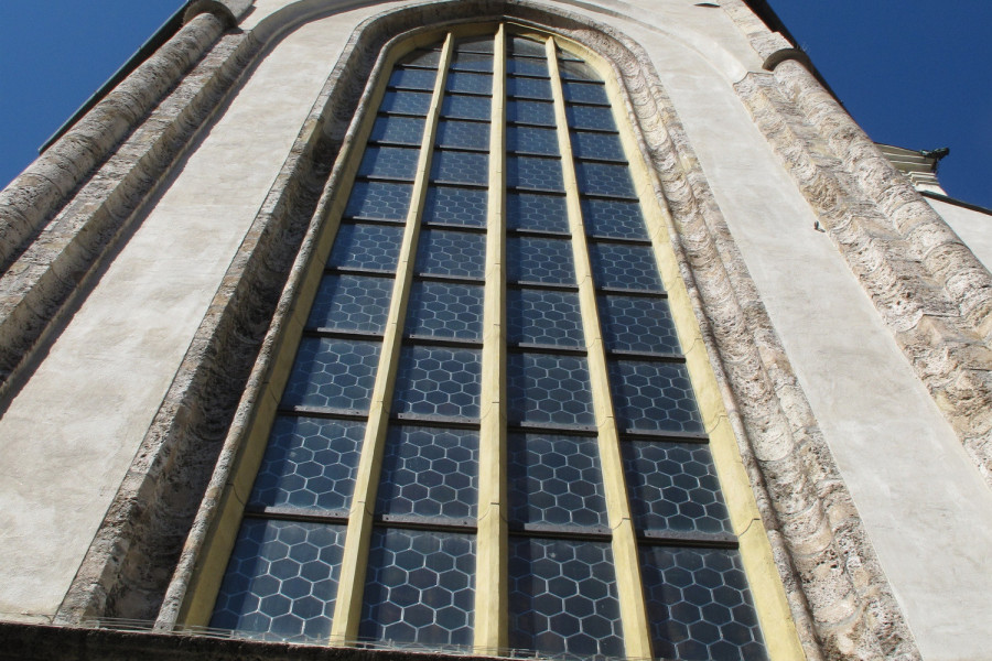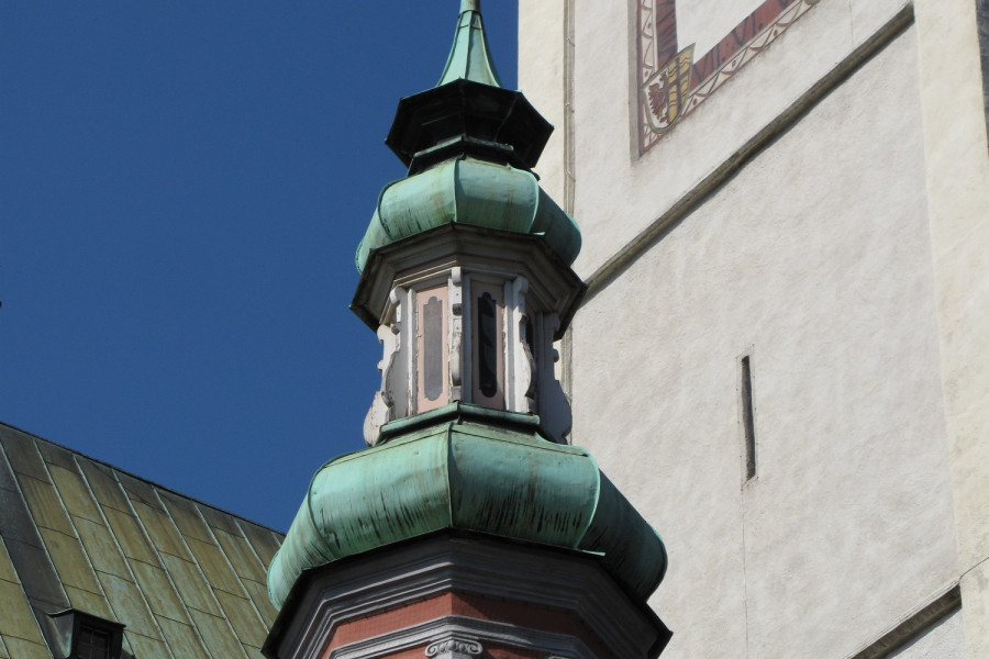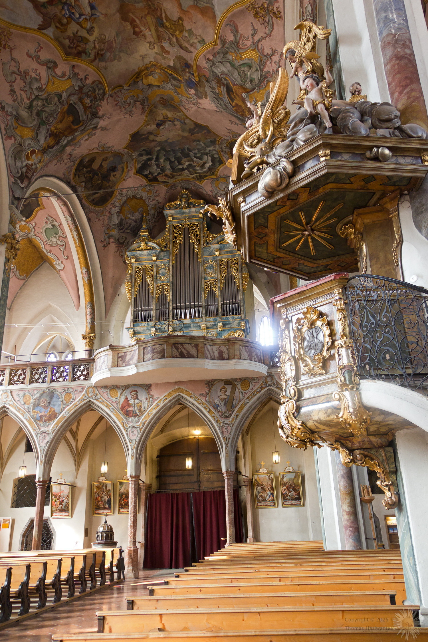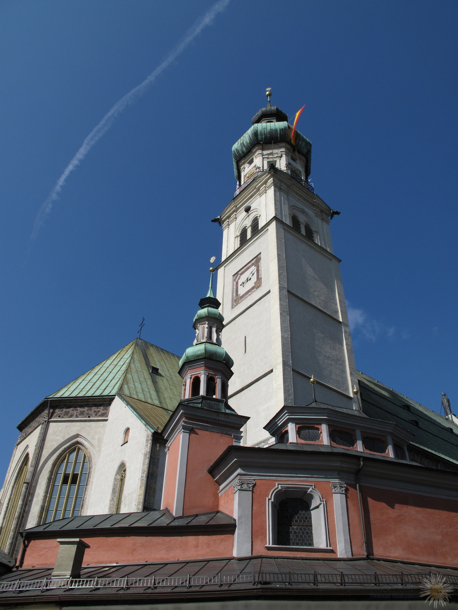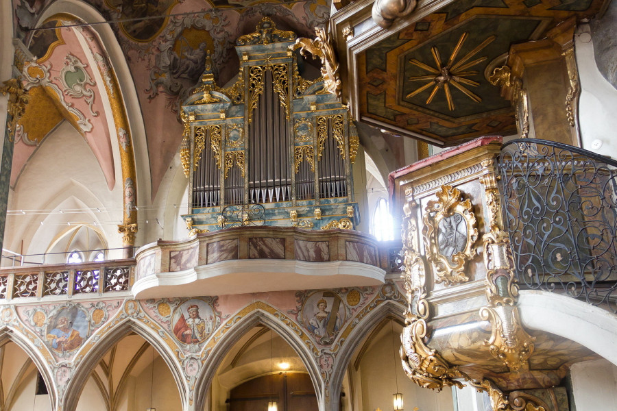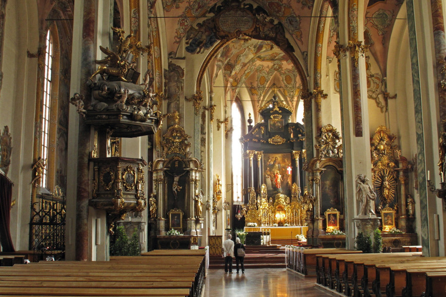 The main church in Hall was originally built in 1281. The gothic nave of the church was finished 1440, and the baroque tower was added in 1676, after the original tower collapsed in a large earthquake.