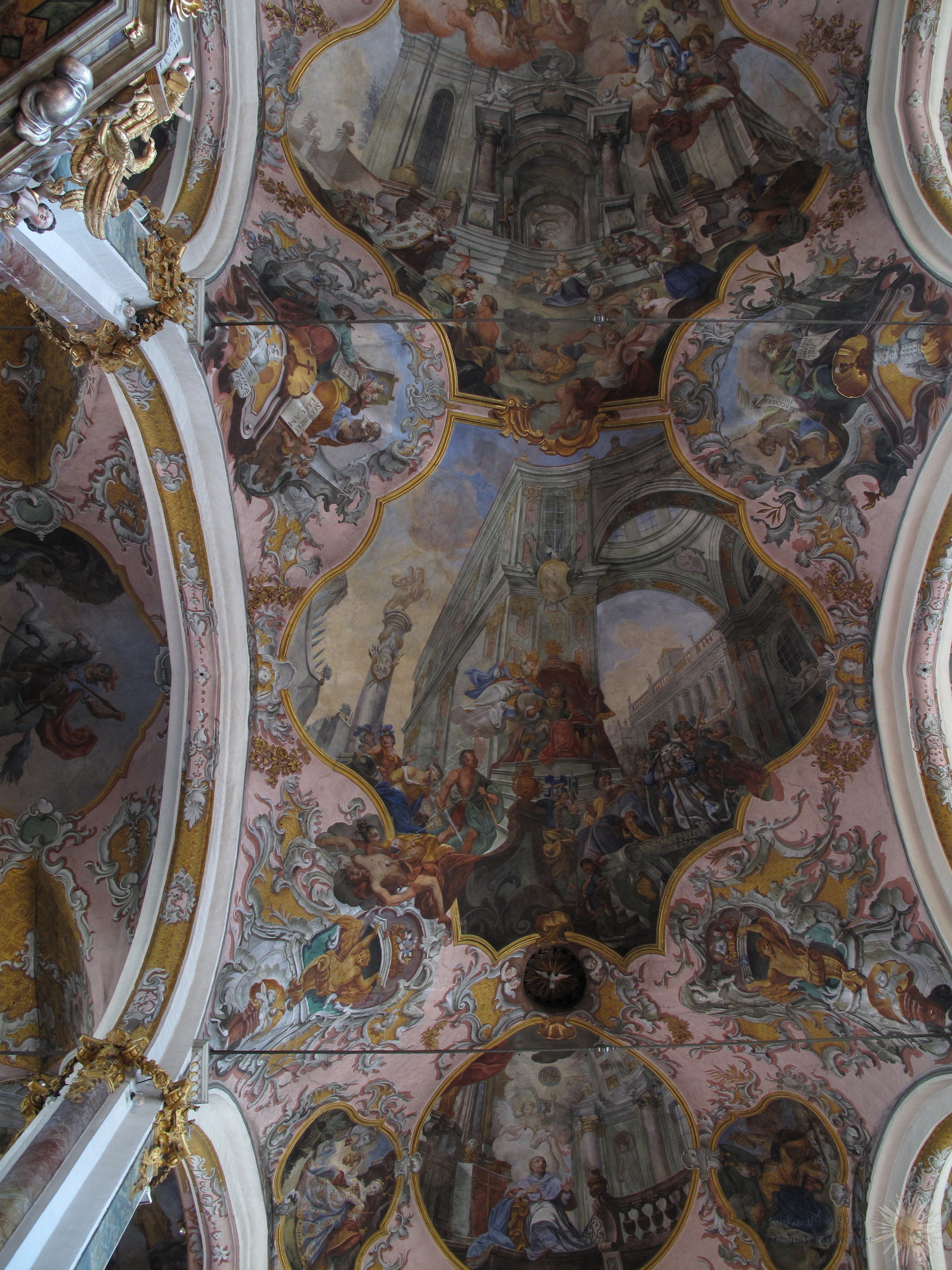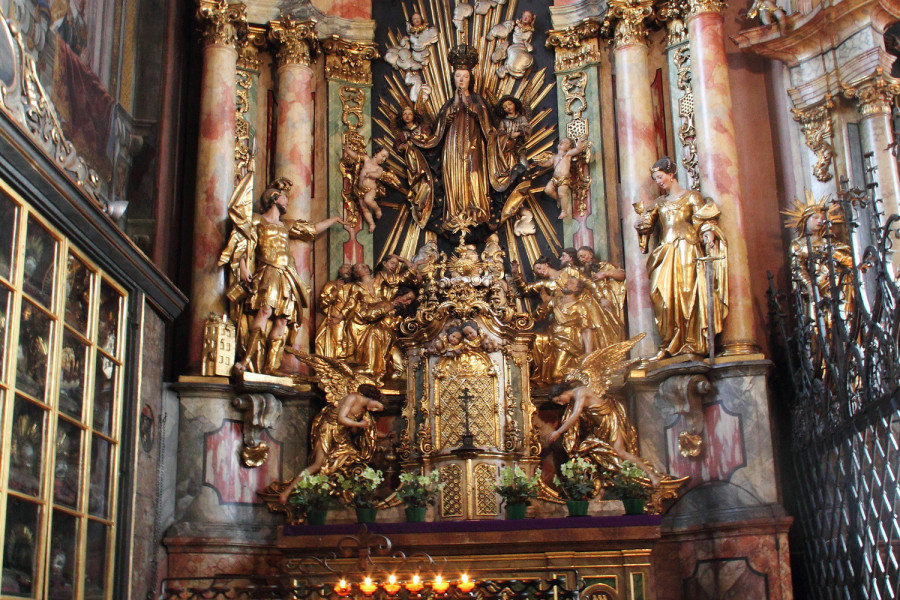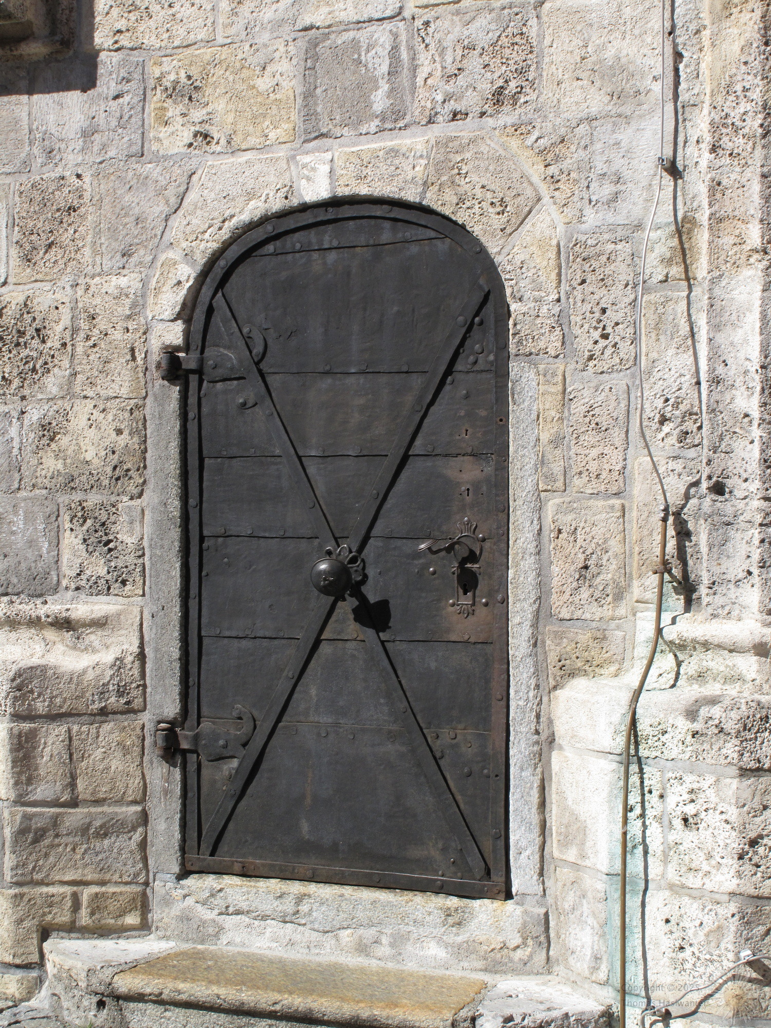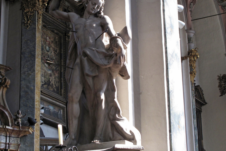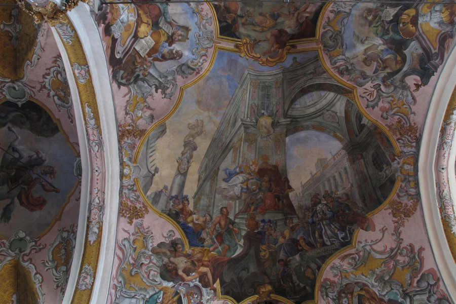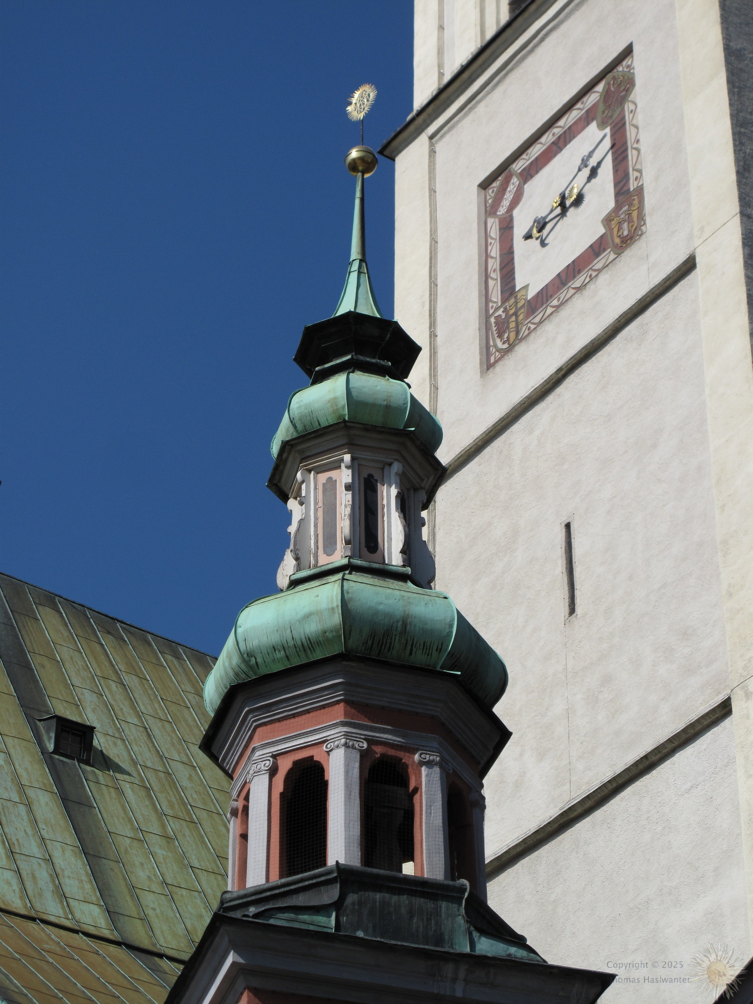 The main church in Hall was originally built in 1281. The gothic nave of the church was finished 1440, and the baroque tower was added in 1676, after the original tower collapsed in a large earthquake.