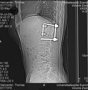 Ironically, after climbing in the mountains for 17 years, my accident happened in a climbing gymn. On April 25 2001, over lunch in a climbing gymn, Sarah missunderstood me, and - instead of lowering me - she disengaged the rope. I fell 12 m, backward. The impact shattered my top lumbar vertrebra, compressing my spinal cord. They got me into hospital fairly quickly. Jean, my wife, was told I’d be in a wheelchair. I wasn’t - but only by 1 mm of nerve fibers, which survived the accident ….