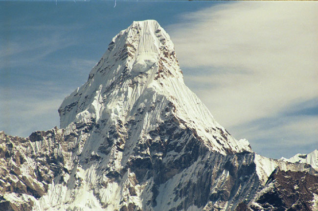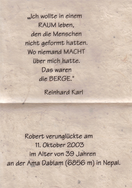 Robert did not get away with it on Ama Dablam, when he slipped while walking back to help a Sherpa carrying up his load. The rope with which he tried to stop his fall snapped. He fell about 100m, 30 of them over a rock cliff. He died there of his injuries.