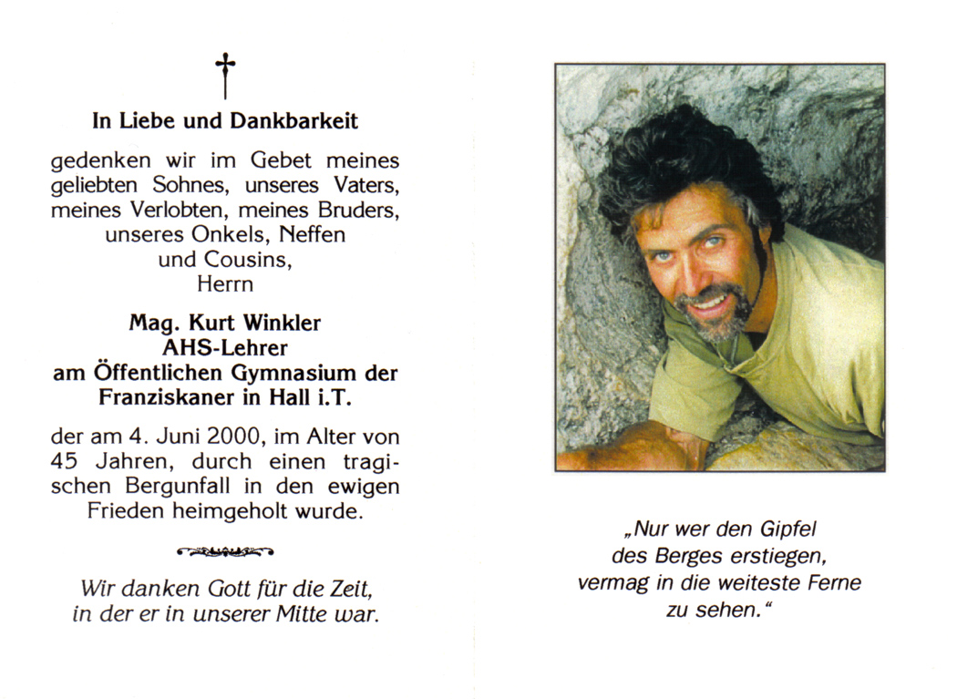 Kurt died on 4. Juni 2000. He was climbing a lot with Hans Salcher, and Hans’ sun put up In memoriam Hans Salcher, which fascinatingly documents the fascination that the mountains had on Hans …